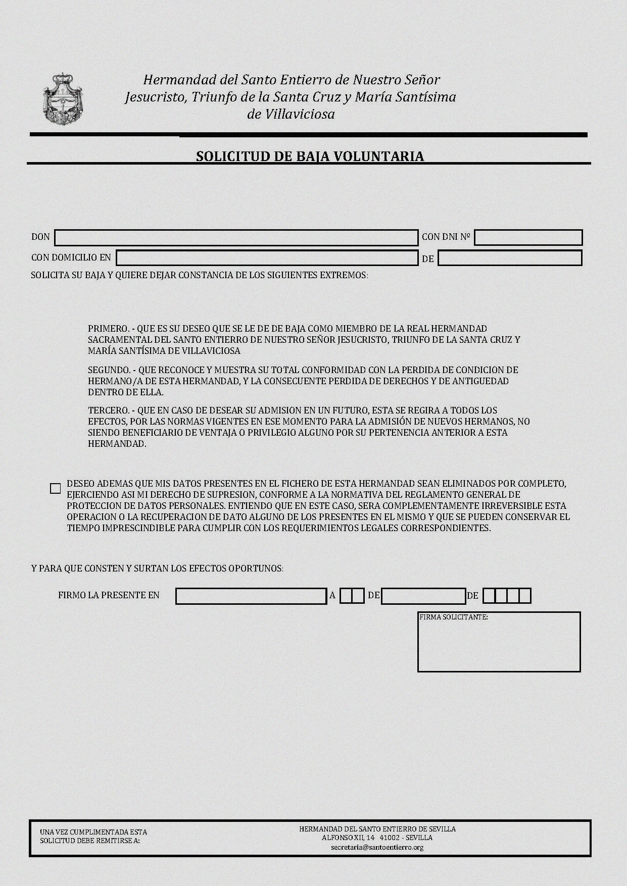 Para proceder a la baja voluntaria de la Real Hermandad del Santo Entierro, deberá descargar y cumplimentar el documento de solicitud que se facilita junto a estas lineas. Una vez firmado, deberá enviarlo escaneado al siguiente correo electrónico: secretaria@santoentierro.org.